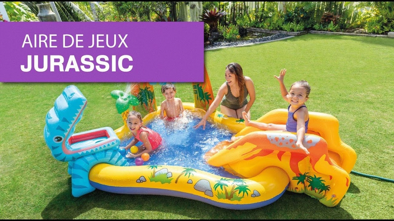 Avec l’aire de jeux Jurassic INTEX, vos enfants auront la possibilité de glisser sur le toboggan, d’atterrir dans la piscine et de nourrir le dinosaure avec les balles colorées !