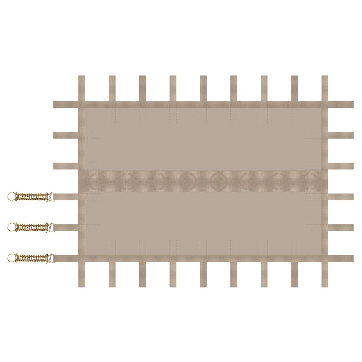 C’est une bâche en tissu enduit PVC 580g/m² traité anti-UV avec renforts par sangles transversales sur la largeur et renforts cristal de 55 cm sous les margelles.